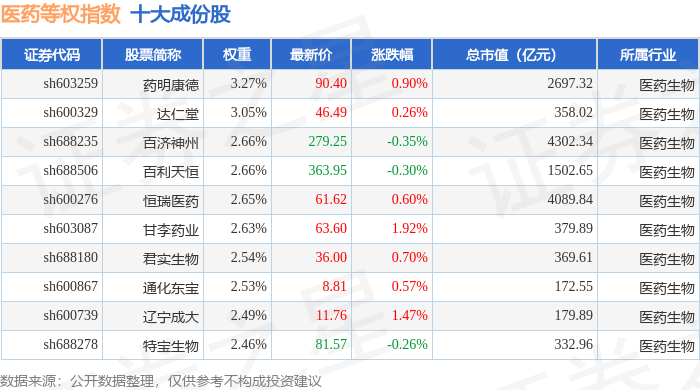 医药等权(000075)指数十大成份股详情如下: