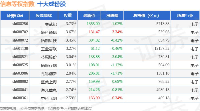 证券之星消息,12月5日,信息等权(000077)指数报收于5852.9点,涨0.3%,成交763.66亿元,换手率1.4%。当日该指数成份股中,上涨的有28家,中科飞测以6.34%的涨幅领涨,下跌的有22家,天岳先进以4.22%的跌幅领跌。