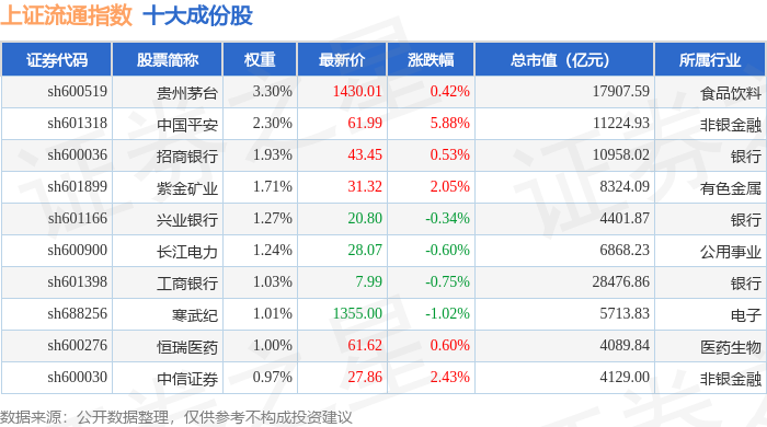 证券之星消息,12月5日,上证流通(000090)指数报收于1415.22点,涨0.99%,成交6927.38亿元,换手率1.05%。当日该指数成份股中,上涨的有1733家,长光华芯以20.0%的涨幅领涨,下跌的有421家,大众公用以9.73%的跌幅领跌。