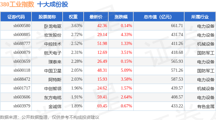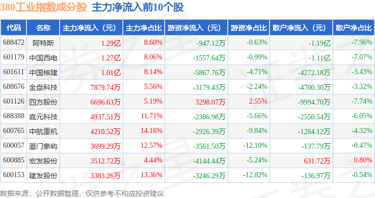 资金流向方面,380工业(000106)指数成份股当日主力资金净流出合计4.33亿元,游资资金净流出合计2.11亿元,散户资金净流入合计6.44亿元。成份股资金流向详情见下表:
