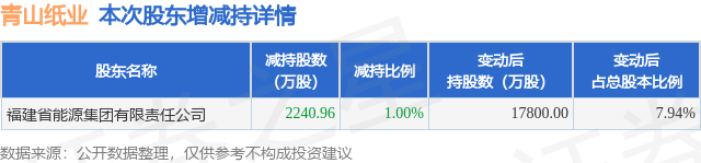 证券之星消息,12月5日青山纸业发布公告《青山纸业:关于控股股东及其一致行动人权益变动触及1%刻度的提示性公告》,其股东福建省能源集团有限责任公司于2025年10月28日至2025年12月5日间合计减持2240.96万股,占公司目前总股本的1.0001%,变动期间该股股价上涨14.29%,截止12月5日收盘报4.24元。