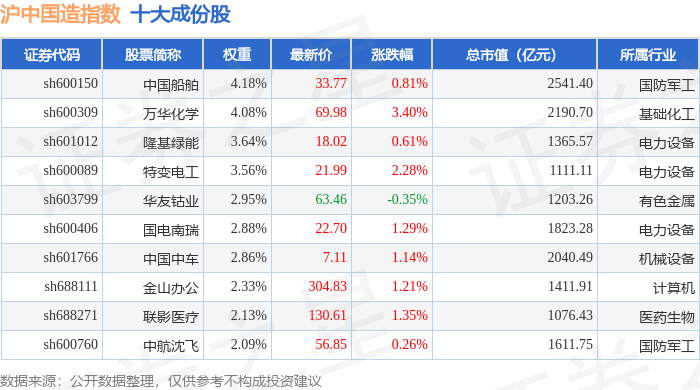 证券之星消息,12月5日,沪中国造(000161)指数报收于1685.7点,涨1.4%,成交856.24亿元,换手率1.46%。当日该指数成份股中,上涨的有127家,铂力特以10.65%的涨幅领涨,下跌的有21家,天岳先进以4.22%的跌幅领跌。