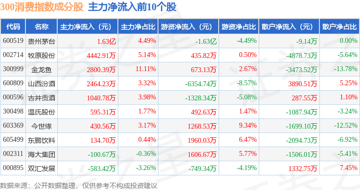 资金流向方面,300消费(000912)指数成份股当日主力资金净流出合计5324.92万元,游资资金净流出合计4947.99万元,散户资金净流入合计1.03亿元。成份股资金流向详情见下表: