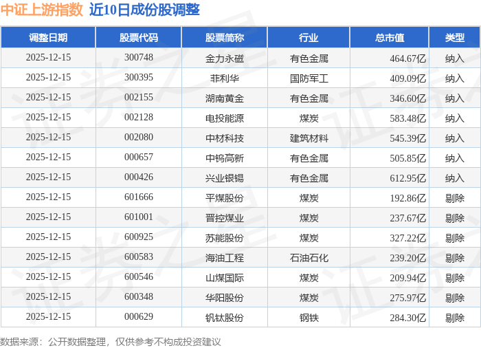 近10日内中证上游(000961)指数成份股做了调整,新纳入了7只股票,剔除了7只股票。