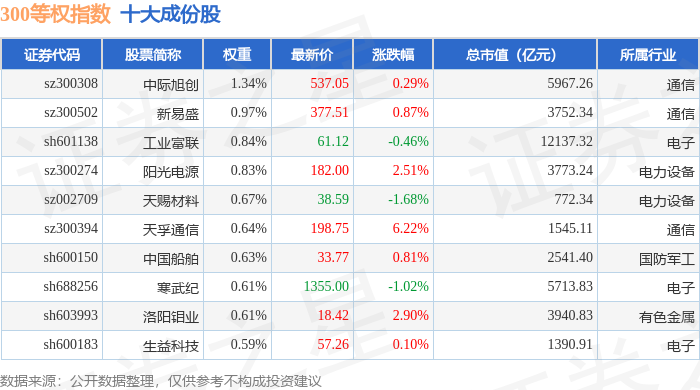 300等权(000984)指数十大成份股详情如下:
