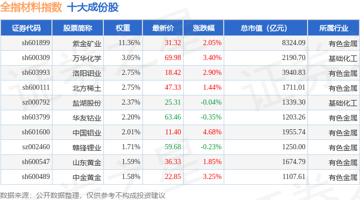 全指材料(000987)指数十大成份股详情如下: