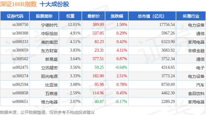 资金流向方面,深证100R(399004)指数成份股当日主力资金净流出合计9.54亿元,游资资金净流入合计1.84亿元,散户资金净流入合计7.7亿元。成份股资金流向详情见下表: