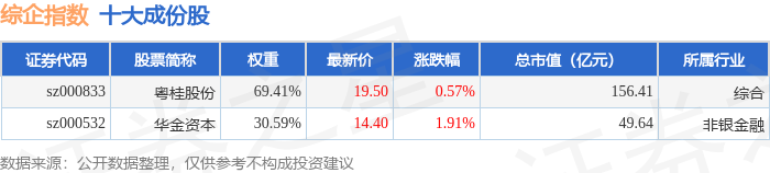 证券之星消息,12月5日,综企指数(399249)报收于3222.4点,涨0.92%,成交6.26亿元,换手率4.17%。当日该指数成份股中,上涨的有2家,华金资本以1.91%的涨幅领涨。