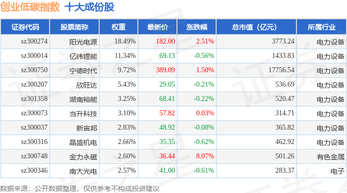 创业低碳(399259)指数十大成份股详情如下: