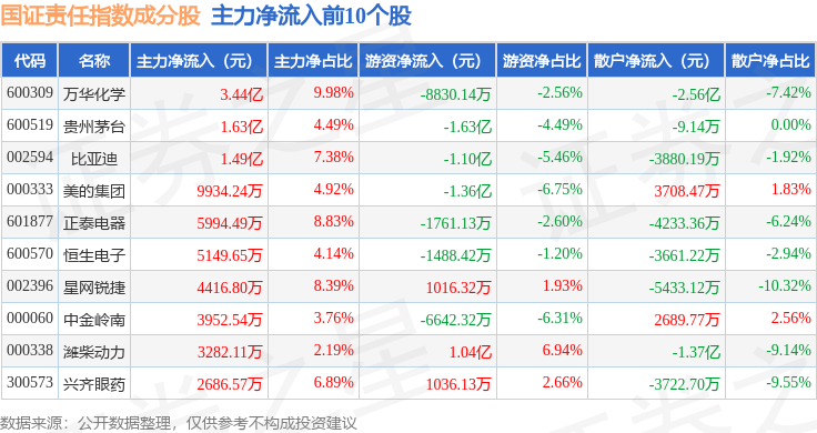 资金流向方面,国证责任(399369)指数成份股当日主力资金净流出合计12.76亿元,游资资金净流入合计2275.16万元,散户资金净流入合计12.65亿元。成份股资金流向详情见下表: