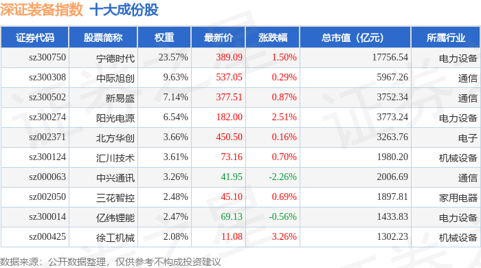 深证装备(399636)指数十大成份股详情如下: