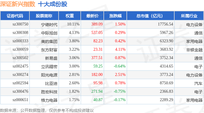 证券之星消息,12月5日,深证新兴(399641)指数报收于2751.31点,涨1.06%,成交2790.21亿元,换手率1.96%。当日该指数成份股中,上涨的有152家,金力永磁以8.07%的涨幅领涨,下跌的有45家,天华新能以4.36%的跌幅领跌。