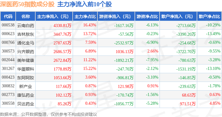 资金流向方面,深医药50(399647)指数成份股当日主力资金净流出合计4.82亿元,游资资金净流出合计4912.95万元,散户资金净流入合计5.32亿元。成份股资金流向详情见下表: