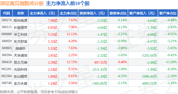 资金流向方面,深证高贝(399662)指数成份股当日主力资金净流入合计6.98亿元,游资资金净流出合计4.87亿元,散户资金净流出合计2.11亿元。成份股资金流向详情见下表: