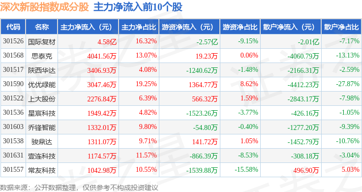 资金流向方面,深次新股(399678)指数成份股当日主力资金净流入合计4.93亿元,游资资金净流出合计4.04亿元,散户资金净流出合计8927.59万元。成份股资金流向详情见下表:
