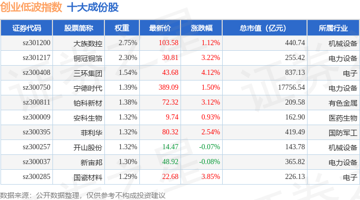 证券之星消息,12月5日,创业低波(399692)指数报收于3801.96点,涨1.09%,成交357.39亿元,换手率1.3%。当日该指数成份股中,上涨的有83家,东岳硅材以4.59%的涨幅领涨,下跌的有15家,华利集团以6.09%的跌幅领跌。