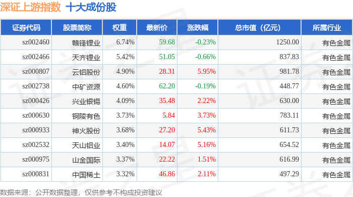 证券之星消息,12月5日,深证上游(399704)指数报收于6301.76点,涨2.81%,成交527.97亿元,换手率3.17%。当日该指数成份股中,上涨的有42家,国际复材以20.03%的涨幅领涨,下跌的有8家,盛新锂能以2.31%的跌幅领跌。