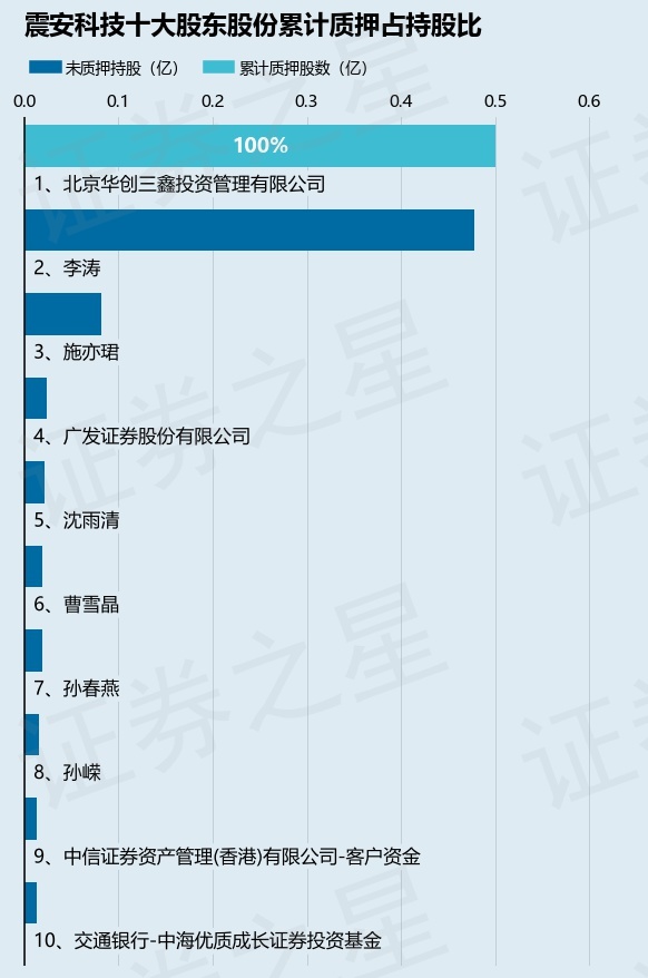 截止本公告日,股东北京华创三鑫投资管理有限公司已累计质押股份5007.29万股,占其持股总数的100.0%。本次质押后震安科技十大股东的累计质押股份占持股比例(占持股比例的计算以公司最新一期财务报表公布的十大股东的持股总数为基准)见下图: