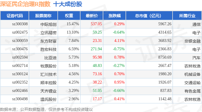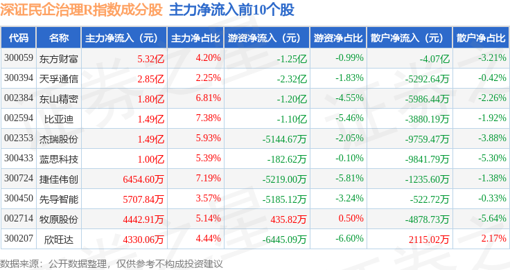 资金流向方面,深证民企治理R(470058)指数成份股当日主力资金净流出合计13.19亿元,游资资金净流入合计4.56亿元,散户资金净流入合计8.63亿元。成份股资金流向详情见下表: