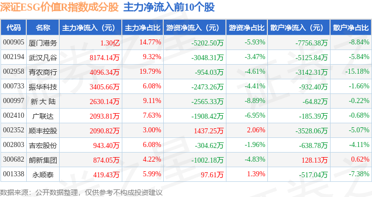 资金流向方面,深证ESG价值R(470061)指数成份股当日主力资金净流出合计5.19亿元,游资资金净流入合计1.33亿元,散户资金净流入合计3.86亿元。成份股资金流向详情见下表: