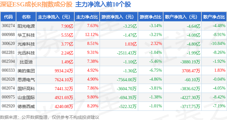 资金流向方面,深证ESG成长R(470060)指数成份股当日主力资金净流入合计8.7亿元,游资资金净流出合计305.92万元,散户资金净流出合计8.67亿元。成份股资金流向详情见下表: