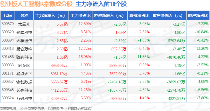 资金流向方面,创业板人工智能R(470070)指数成份股当日主力资金净流入合计1484.13万元,游资资金净流入合计6.17亿元,散户资金净流出合计6.32亿元。成份股资金流向详情见下表: