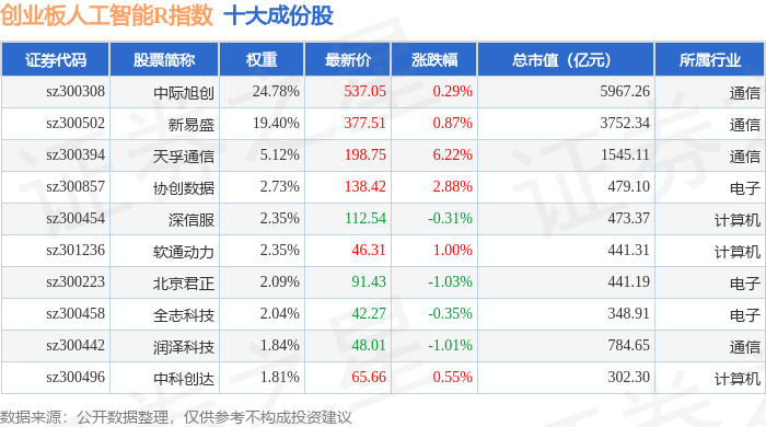 创业板人工智能R(470070)指数十大成份股详情如下: