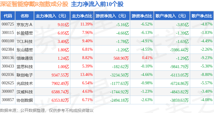 资金流向方面,深证智能穿戴R(470074)指数成份股当日主力资金净流入合计15.31亿元,游资资金净流出合计13.0亿元,散户资金净流出合计2.31亿元。成份股资金流向详情见下表: