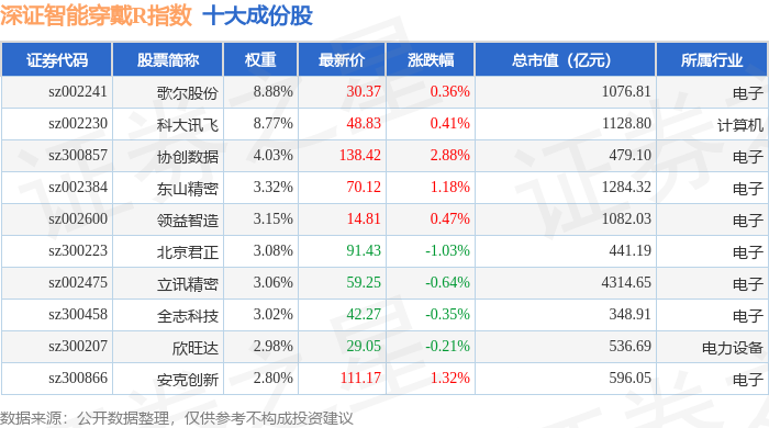 深证智能穿戴R(470074)指数十大成份股详情如下: