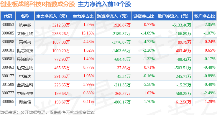 资金流向方面,创业板战略科技R(471004)指数成份股当日主力资金净流出合计10.64亿元,游资资金净流入合计2.02亿元,散户资金净流入合计8.62亿元。成份股资金流向详情见下表:
