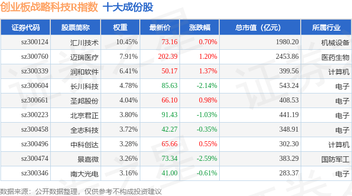 创业板战略科技R(471004)指数十大成份股详情如下: