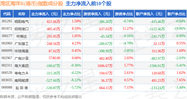 资金流向方面,湾区海洋R(港币)(480020)指数成份股当日主力资金净流出合计2011.2万元,游资资金净流入合计3327.54万元,散户资金净流出合计1316.34万元。成份股资金流向详情见下表:
