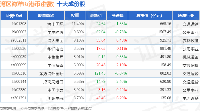 湾区海洋R(港币)(480020)指数十大成份股详情如下: