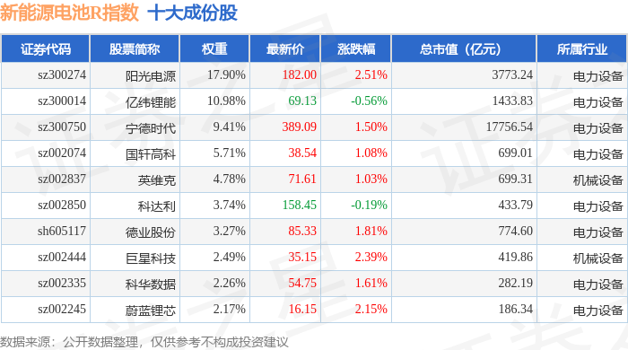 近10日内新能源电池R(480027)指数成份股做了调整,新纳入了5只股票,剔除了1只股票。