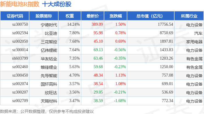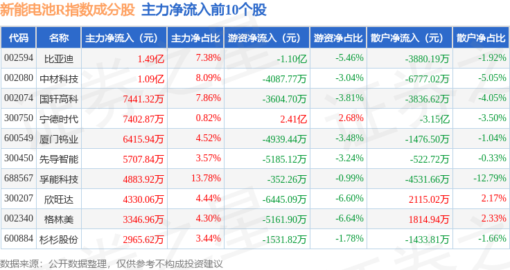 资金流向方面,新能电池R(480032)指数成份股当日主力资金净流出合计15.89亿元,游资资金净流入合计5387.73万元,散户资金净流入合计15.37亿元。成份股资金流向详情见下表: