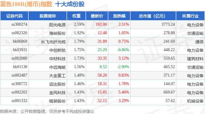 蓝色100R(港币)(480069)指数十大成份股详情如下: