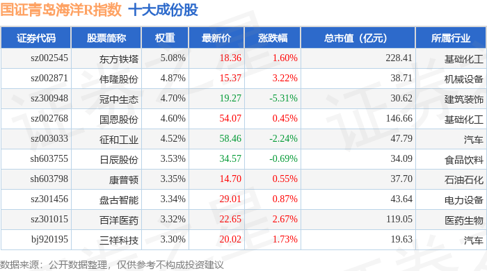 国证青岛海洋R(480532)指数十大成份股详情如下: