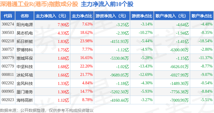 资金流向方面,深港通工业R(港币)(483018)指数成份股当日主力资金净流入合计16.6亿元,游资资金净流出合计19.11亿元,散户资金净流入合计2.51亿元。成份股资金流向详情见下表: