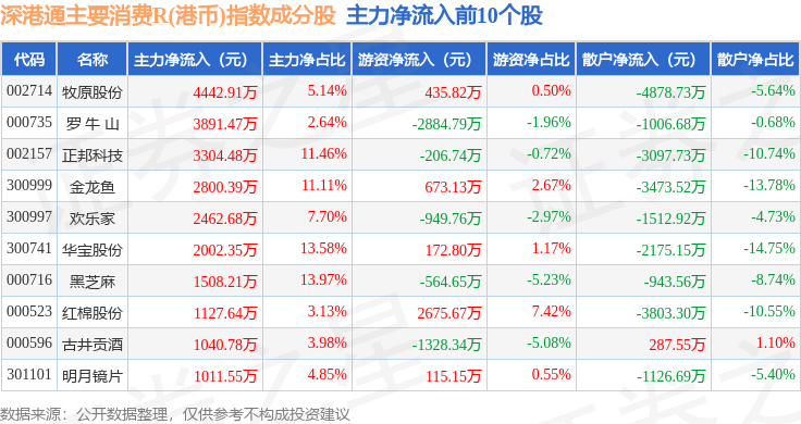 资金流向方面,深港通主要消费R(港币)(483022)指数成份股当日主力资金净流出合计2.76亿元,游资资金净流出合计894.83万元,散户资金净流入合计2.85亿元。成份股资金流向详情见下表: