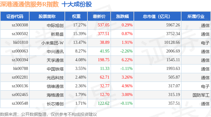 深港通通信服务R(483033)指数十大成份股详情如下: