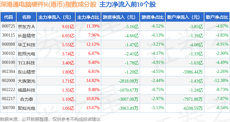 资金流向方面,深港通电脑硬件R(港币)(483044)指数成份股当日主力资金净流入合计1.86亿元,游资资金净流出合计14.95亿元,散户资金净流入合计13.09亿元。成份股资金流向详情见下表: