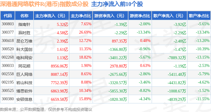 资金流向方面,深港通网络软件R(港币)(483048)指数成份股当日主力资金净流入合计15.08亿元,游资资金净流出合计8.48亿元,散户资金净流出合计6.6亿元。成份股资金流向详情见下表: