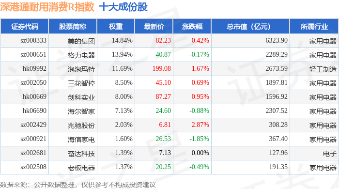 深港通耐用消费R(483049)指数十大成份股详情如下: