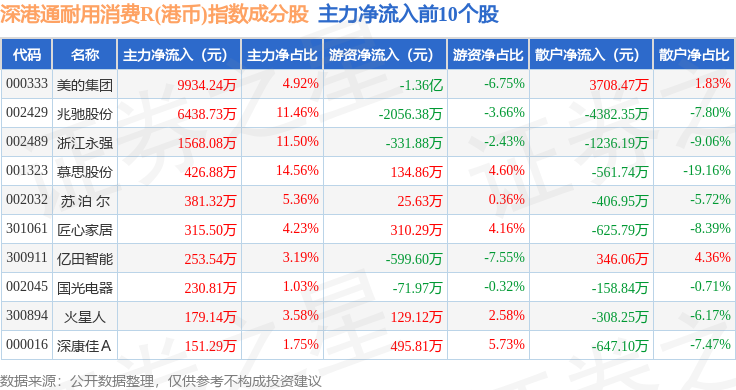 资金流向方面,深港通耐用消费R(港币)(483050)指数成份股当日主力资金净流出合计14.12亿元,游资资金净流入合计5.38亿元,散户资金净流入合计8.74亿元。成份股资金流向详情见下表: