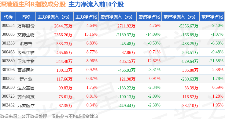 资金流向方面,深港通生科R(483059)指数成份股当日主力资金净流出合计1.54亿元,游资资金净流出合计3385.02万元,散户资金净流入合计1.88亿元。成份股资金流向详情见下表: