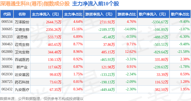 资金流向方面,深港通生科R(港币)(483060)指数成份股当日主力资金净流出合计1.54亿元,游资资金净流出合计3385.02万元,散户资金净流入合计1.88亿元。成份股资金流向详情见下表: