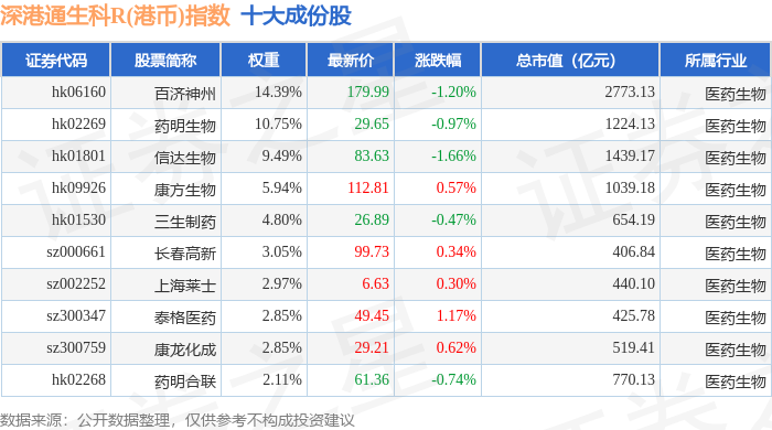 深港通生科R(港币)(483060)指数十大成份股详情如下: