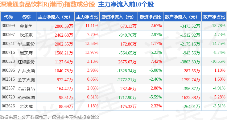 资金流向方面,深港通食品饮料R(港币)(483066)指数成份股当日主力资金净流出合计2.07亿元,游资资金净流出合计1990.33万元,散户资金净流入合计2.27亿元。成份股资金流向详情见下表: