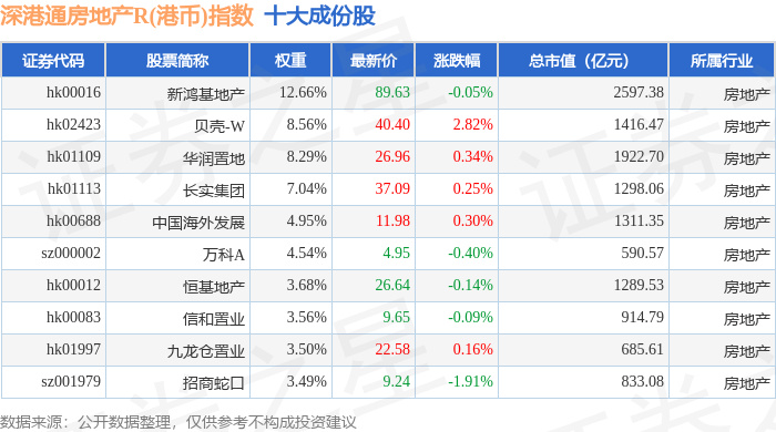 深港通房地产R(港币)(483072)指数十大成份股详情如下: