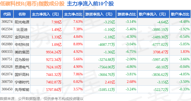 资金流向方面,低碳科技R(港币)(483161)指数成份股当日主力资金净流入合计1.28亿元,游资资金净流出合计2.74亿元,散户资金净流入合计1.47亿元。成份股资金流向详情见下表: